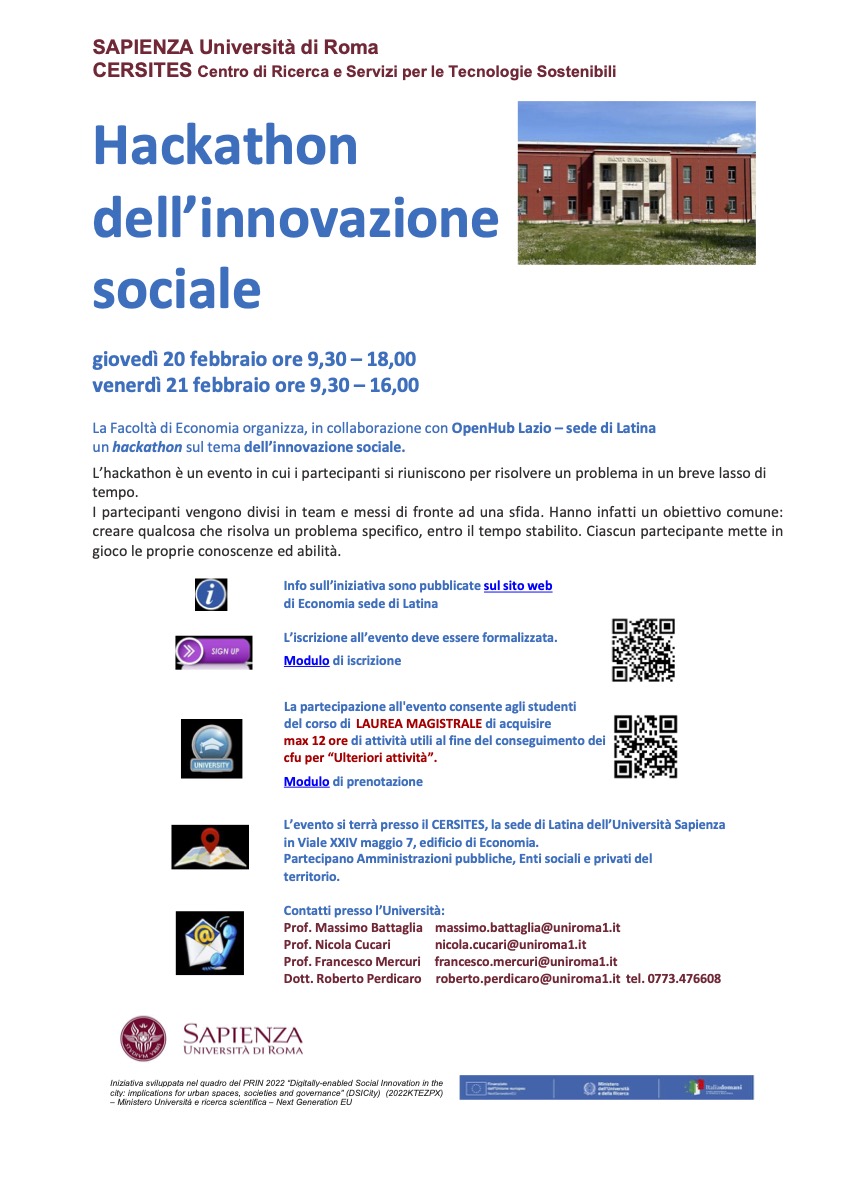 Sapienza University of Rome, in collaboration with OpenHub Lazio – Latina branch, is excited to host a Social Innovation Hackathon! This two-day event brings together students, researchers, and professionals to collaboratively tackle societal challenges and develop innovative solutions.