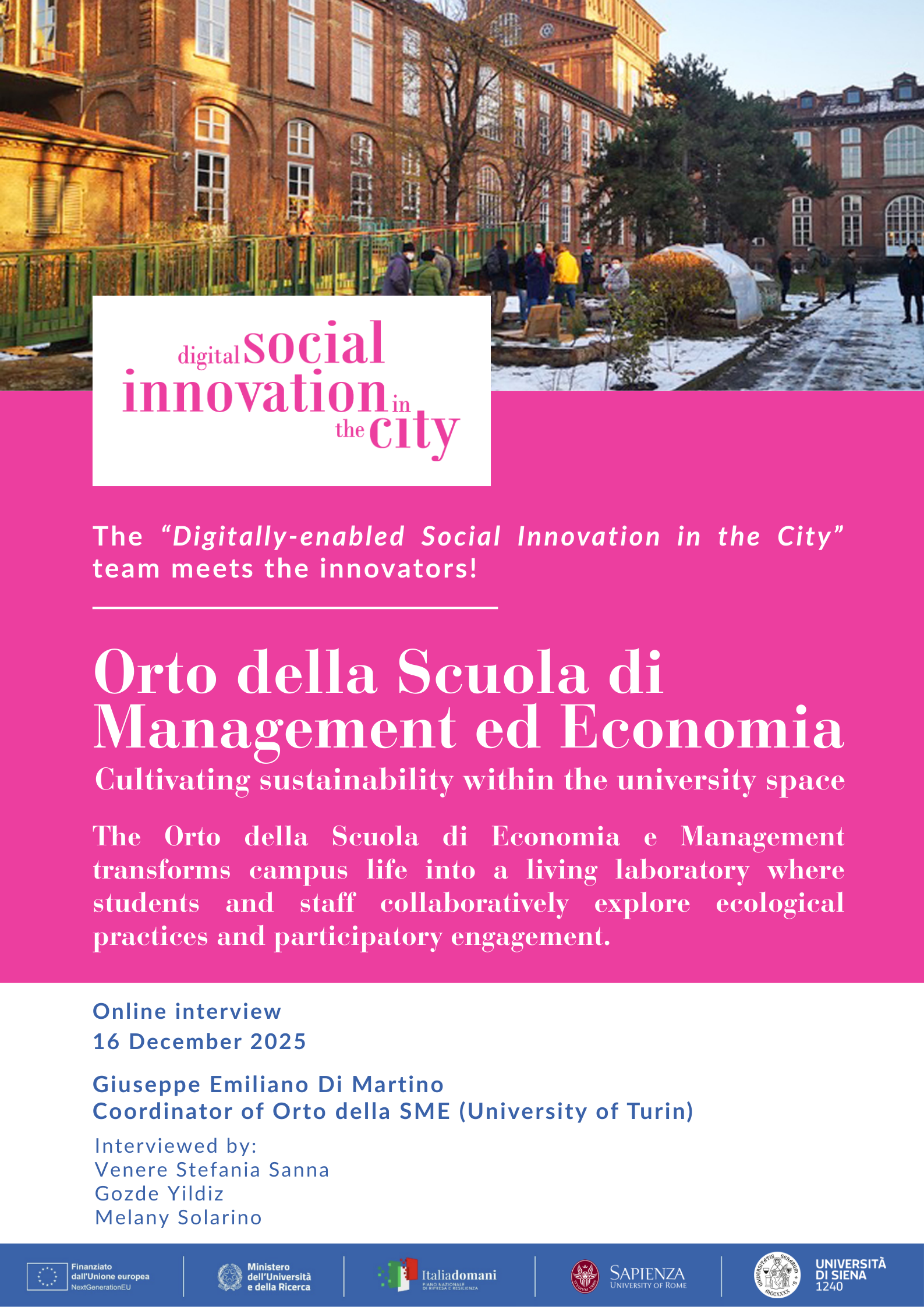 The project team will meet with Giuseppe Di Martino, project coordinator and fellow researcher of “Orto della SME” (Orto della Scuola di Management ed Economia) to better understand how the initiative came about, what its objectives are, what its characteristics are and what its future prospects are. We are excited to learn more about how this group of young innovators was able to transform a degraded area into a green and inclusive ecosystem, hosted by the School of Management and Economics, in Turin!