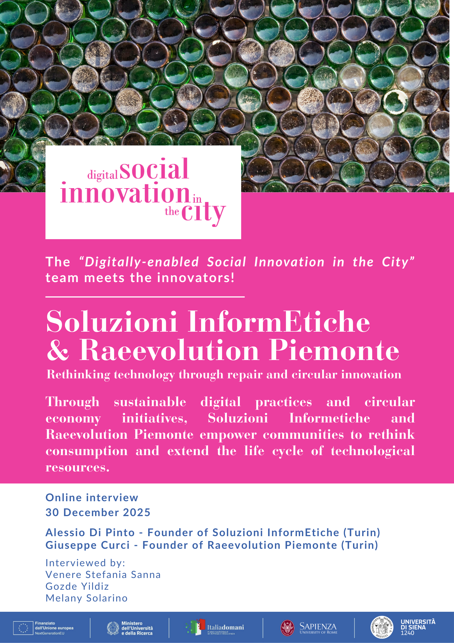 The project team will meet with Antonio Alessio Di Pinto & Giuseppe, founders and leaders of “Soluzioni InformEtica – RaeEvolution” a digital social innovation initiative that aims, first and foremost, to raise awareness and disseminate the concept of “Informatics”, i.e. the ethical use of information technology and IT tools, and thus to promote the behaviour that it inspires! The project wil meet with them to better understand how their activity contributes to the growing world of digital social innovation in Turin and Italy!