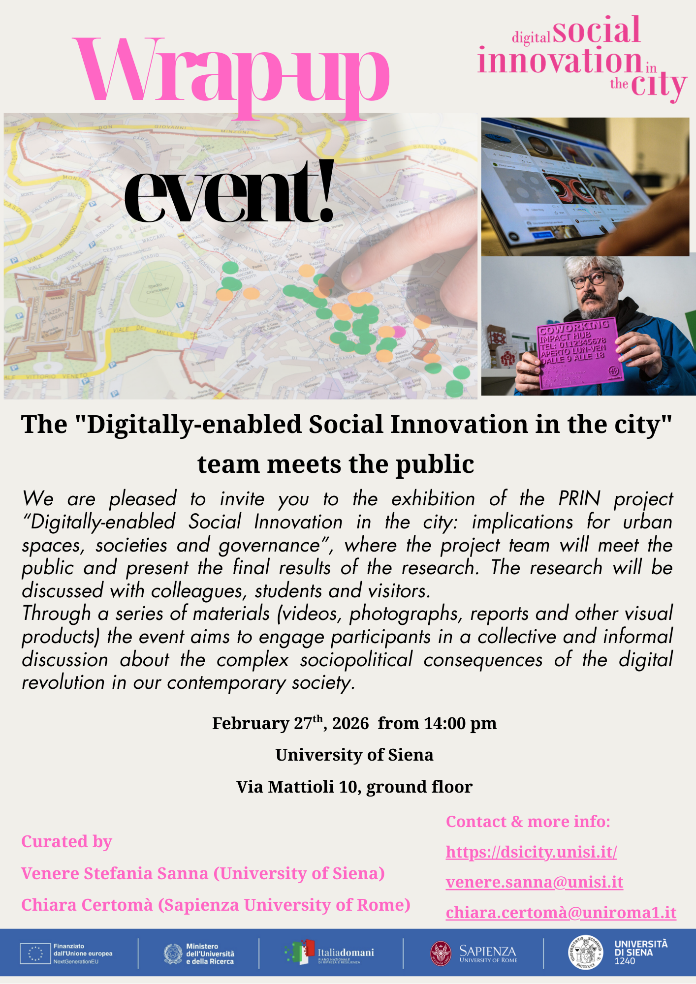 We are pleased to invite you to the exhibition of the PRIN project Digitally-enabled Social Innovation in the city: implications for urban spaces, societies and governance, where the project team will meet the public and present the final results of the research. The research will be discussed with colleagues, students and visitors.